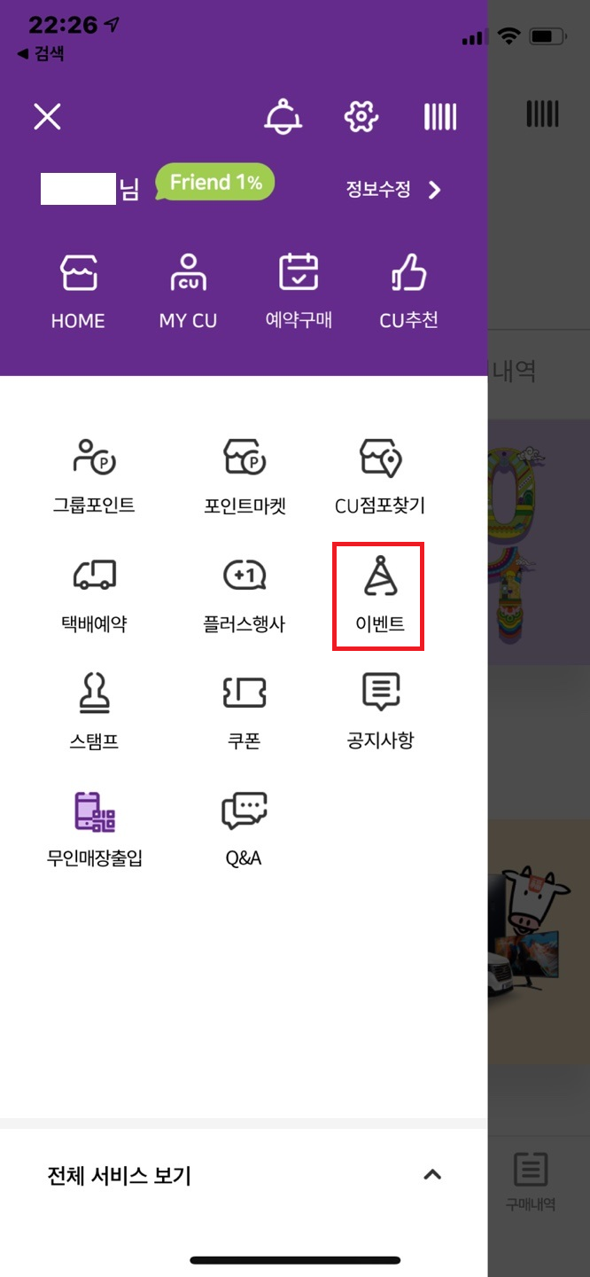 포켓CU 앱 홈에서 왼쪽 "상단 메뉴"를 클릭!!