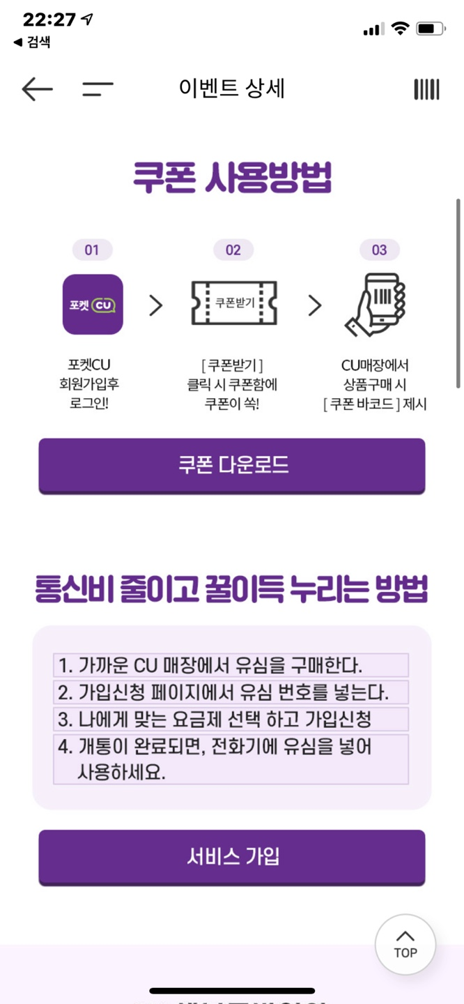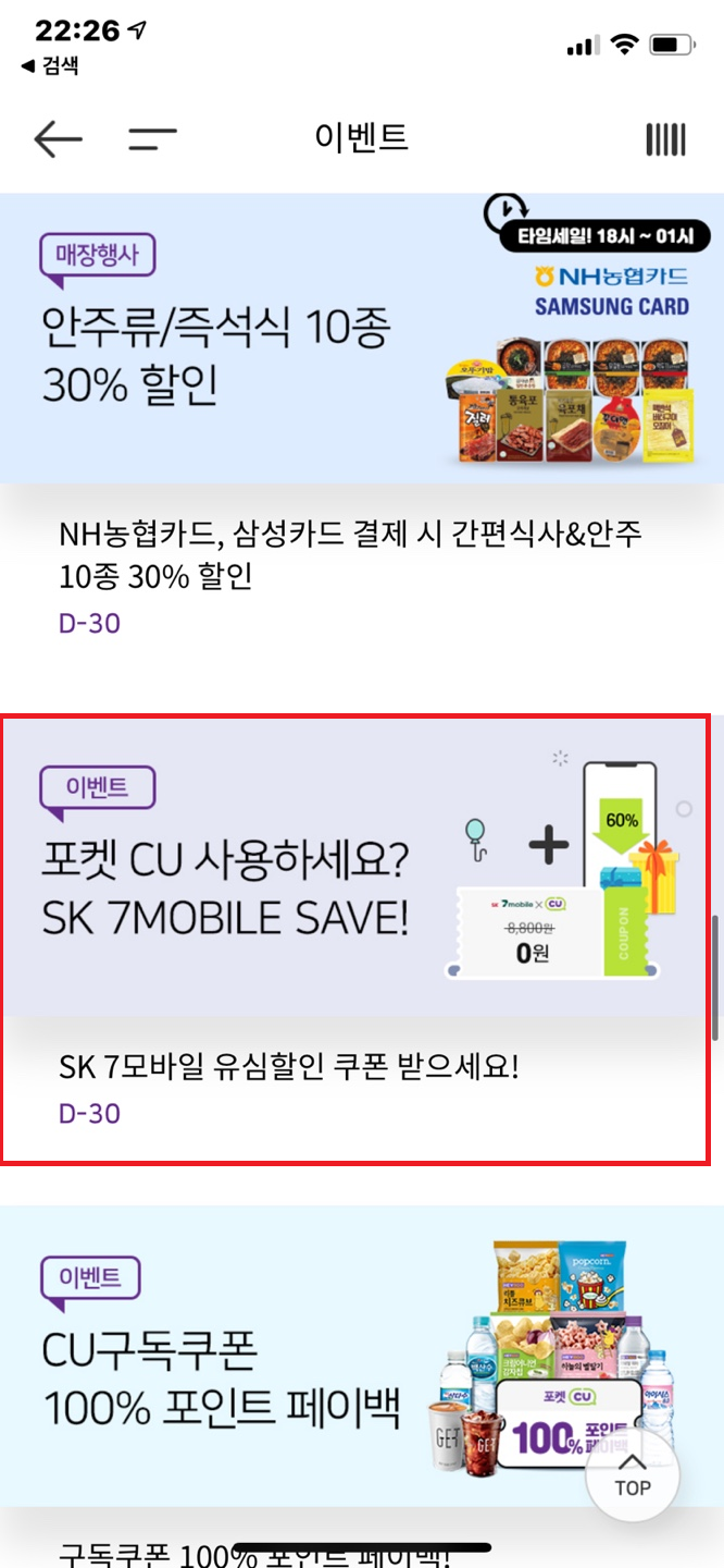 포켓CU 앱에서 SK 7 mobile 유심 무료